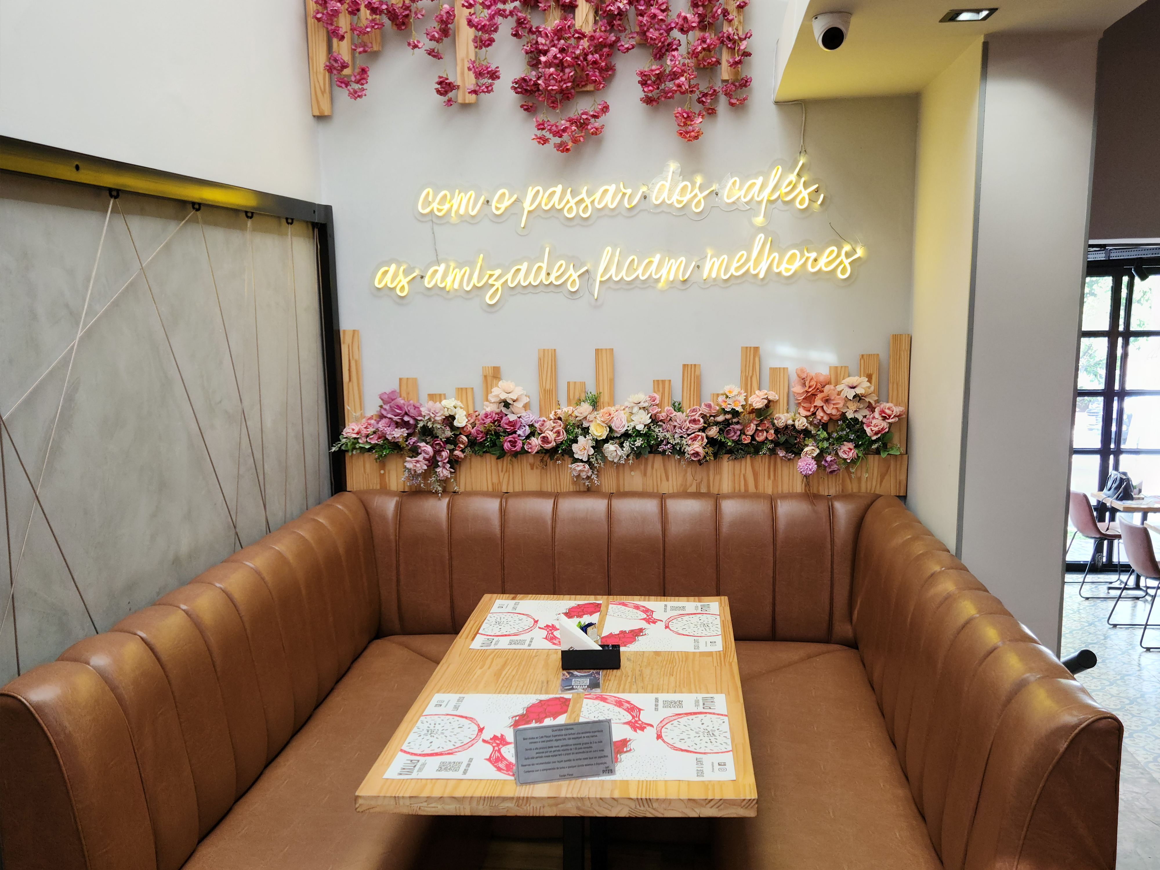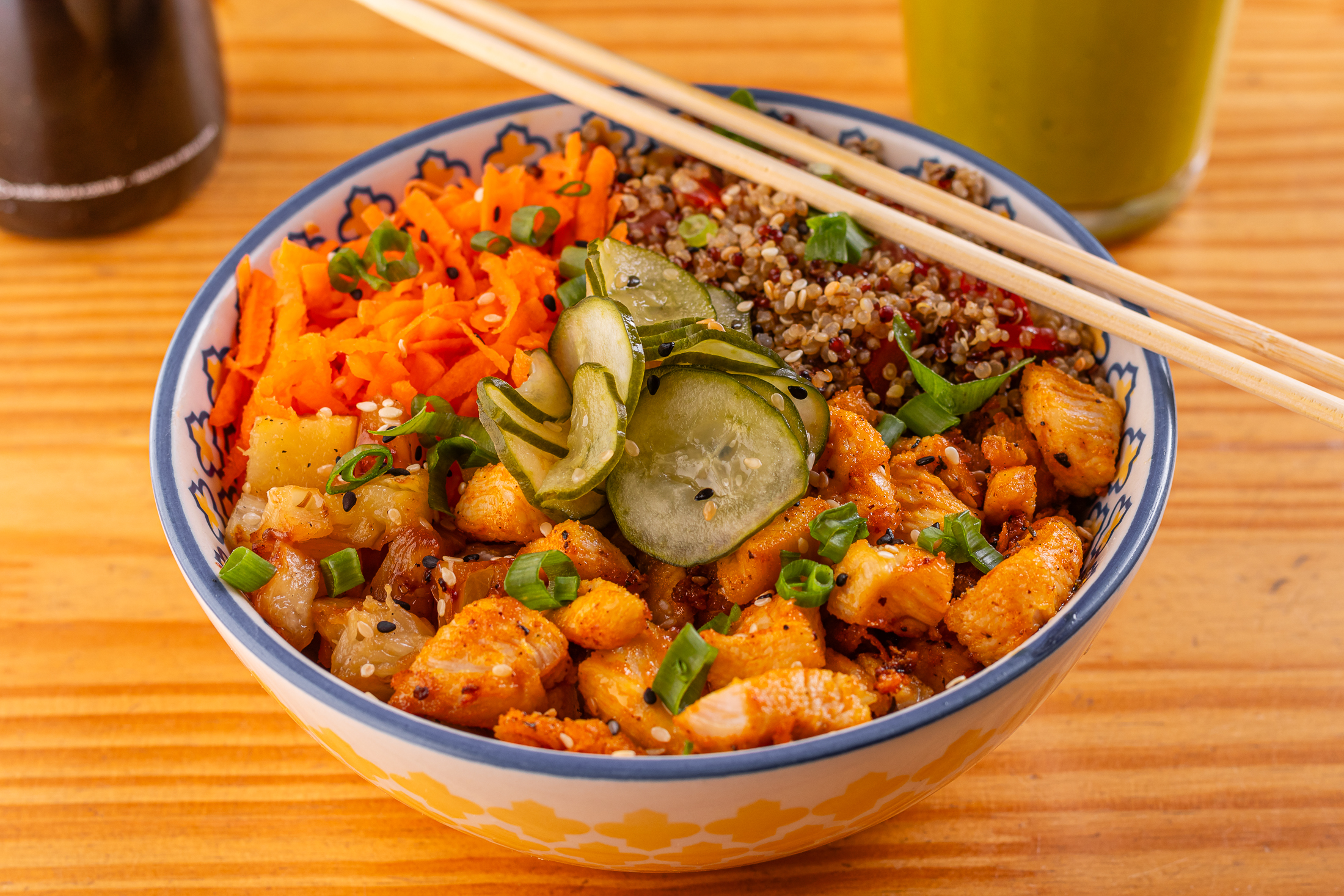 Em cubos, gohan, quinoa temperada com tomate,cenoura, pepino agridoce, abacaxi grelhado, sour cream, gergelim e molho tarê