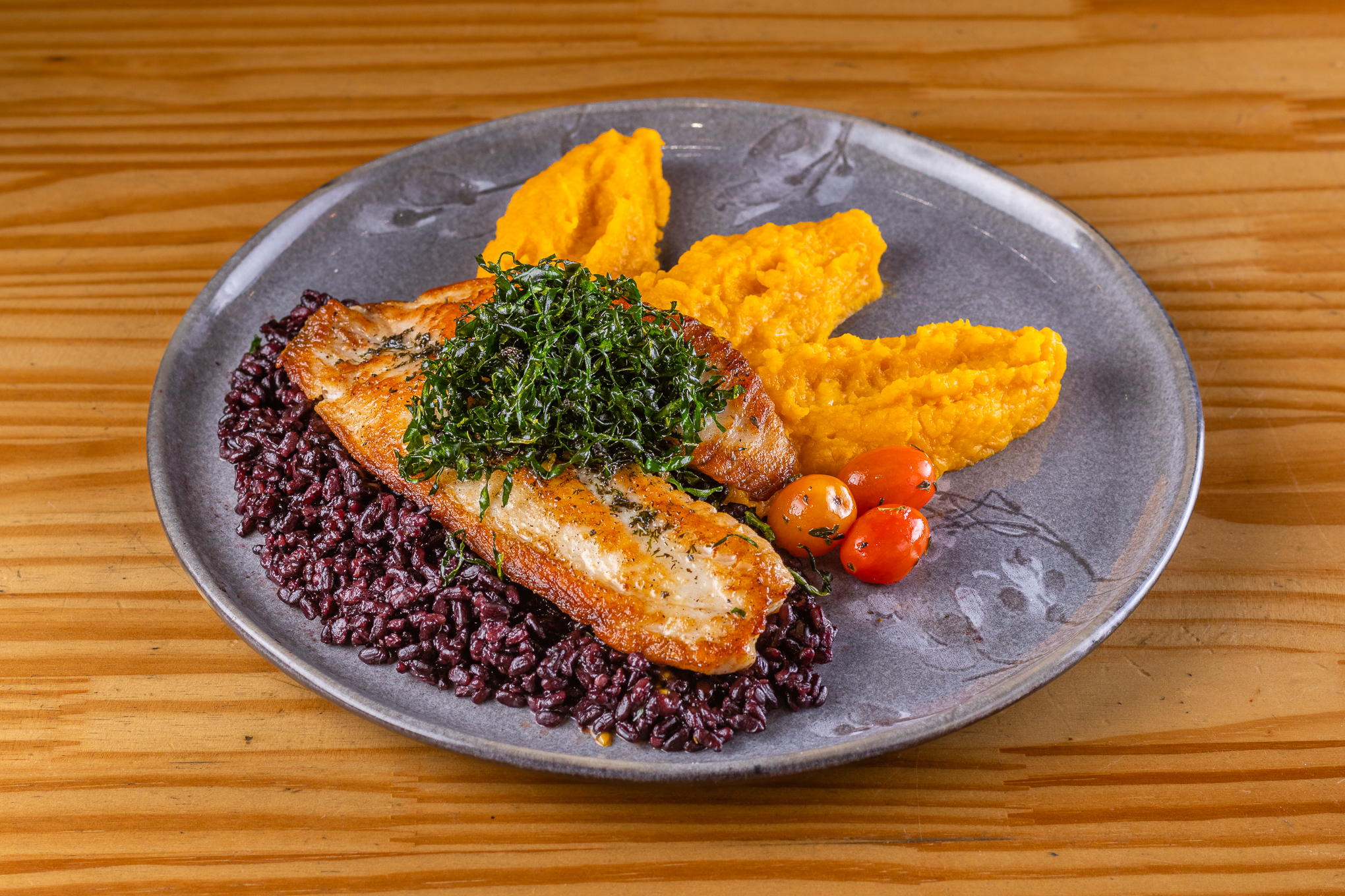 Arroz negro, purê de abóbora cabotiá, crispy de couve e tomate cereja