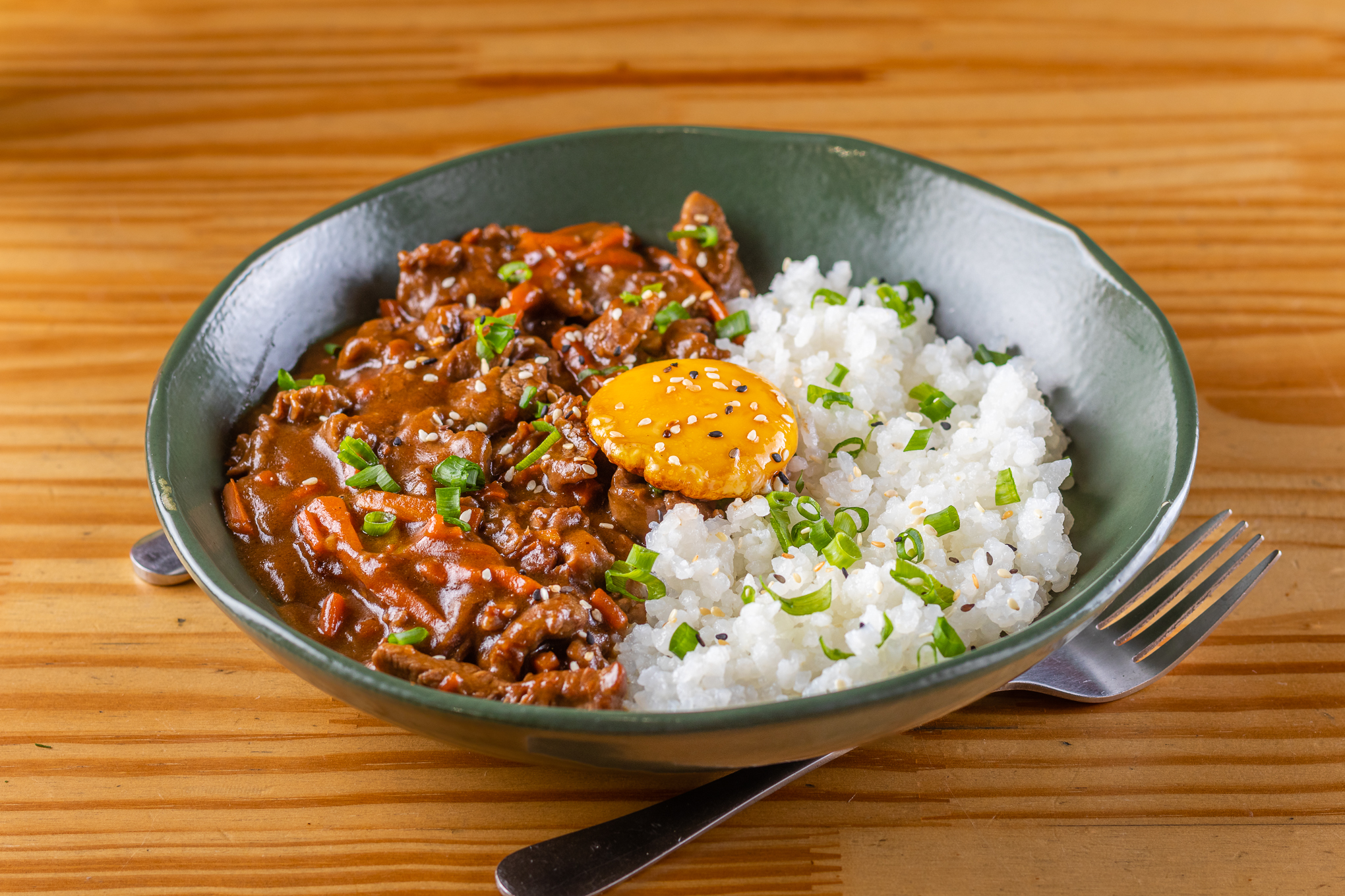 Tiras de mignon ao molho thai (gengibre, shoyu, saque e especiarias), cebolinha, gohan e gema de ovo frita