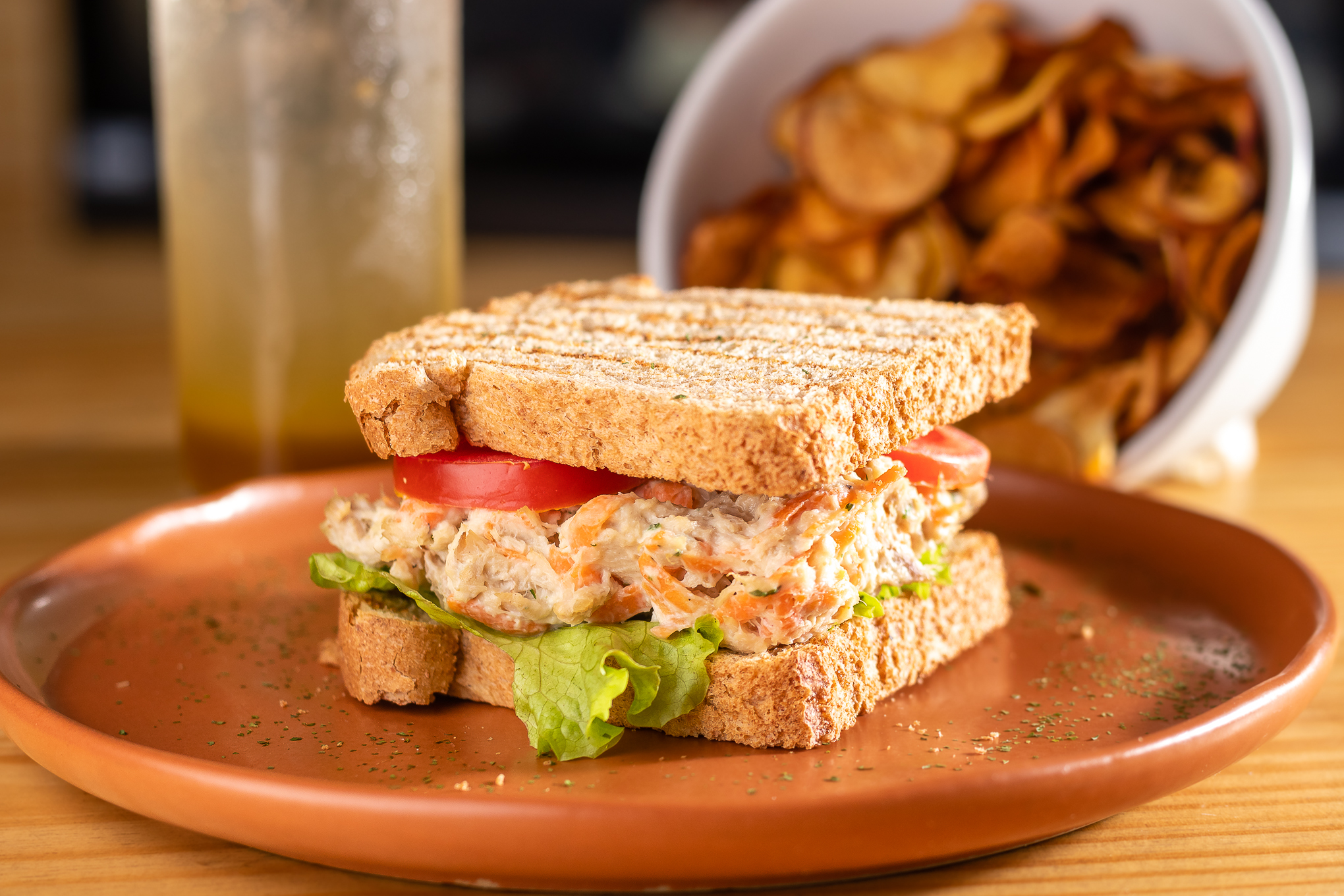 Pasta de atum com requeijão, cenoura, cebolinha, alface e tomate no pão de forma integral